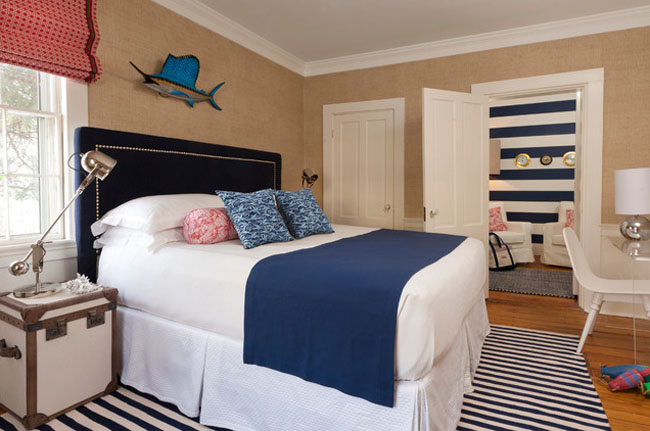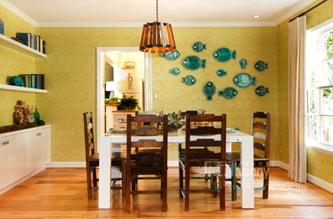 若以多种类海鱼的姿态颜色作为壁纸,也非常的有趣味,如同营造出一个海底世界般的居室;重复的鱼图案也能表现出一种秩序之美。然而同时需要注意的是,为了整个家居环境看起来协调搭配,鱼图案的壁纸应当少量使用、作为点缀,而大面积使用则说不定会有喧宾夺主、吵闹的效果。